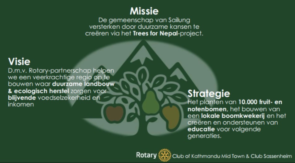 Trees for Nepal is een internationaal Global Grant Project dat Rotaryclub Sassenheim en Rotaryclub Kathmandu Mid-Town (Nepal) gezamenlijk uitvoeren. Trees for Nepal – Global Grant Project GG2688688