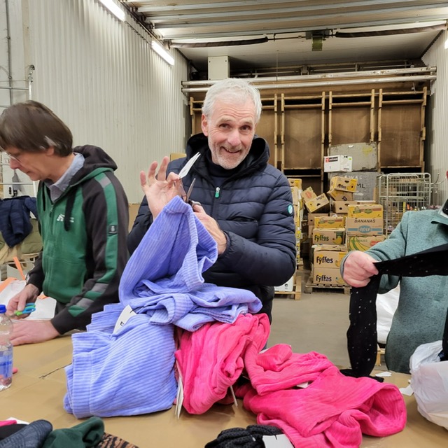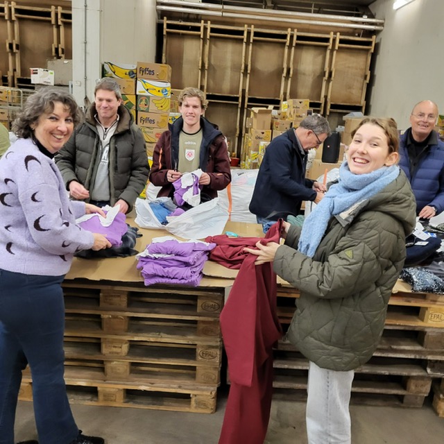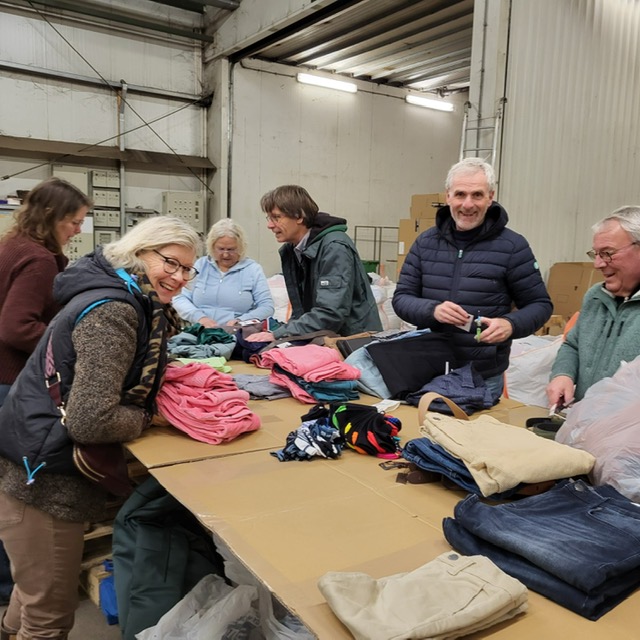 Zo wordt er ook kleding gestuurd. De kleding die vandaag klaargemaakt moest worden voor transport was nieuwe kleding die gedoneerd is door diverse bedrijven. Er lag 25 kubieke meter nieuwe kleding op ons te wachten waar het prijskaartje van verwijderd moest worden en vervolgens gesorteerd. We werkten samen met een aantal leden van de Ronde Tafel en natuurlijk de vrijwilligers van DCA zelf. Na enige tijd was alle deze kleding klaar voor transport naar de mensen in Charkov, Oekraïne die het nu hard nodig hebben. Fijn dat we dit met elkaar hebben kunnen doen vandaag.